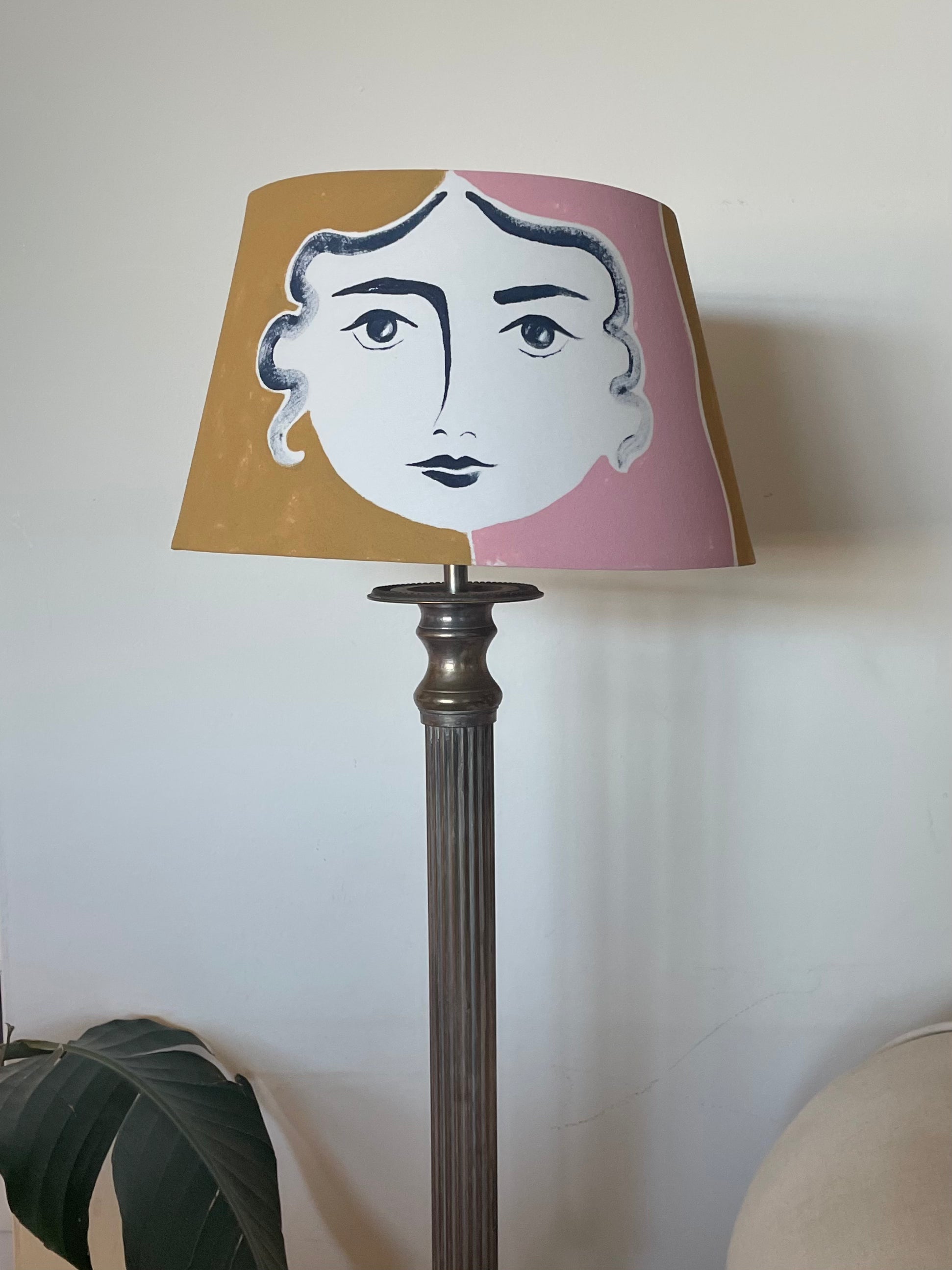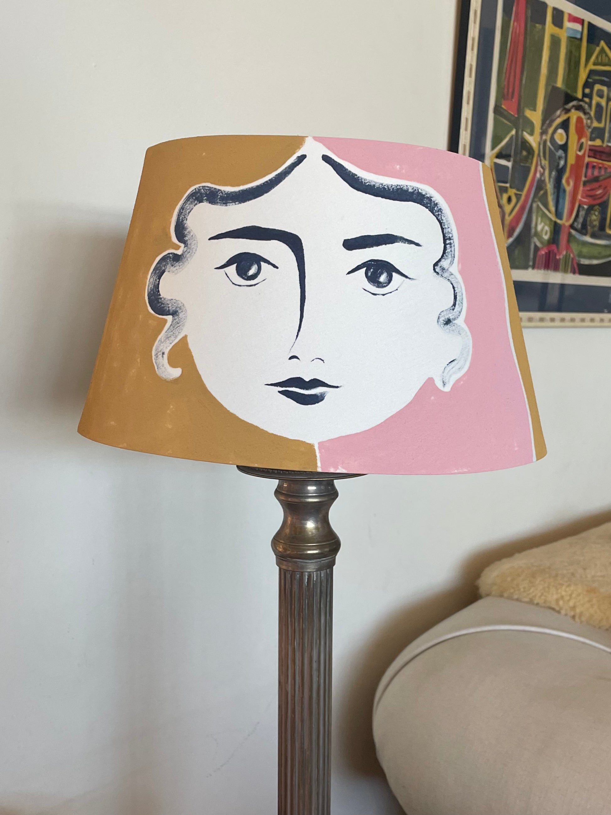 A hand-painted calico lampshade in India Yellow and Rose Pink on a classical theme of Ancient Greece. Inspired by a trip to the British Museum to view The Parthenon Sculptures, and designed to bring a sense of myth and legend in to your home interiors.