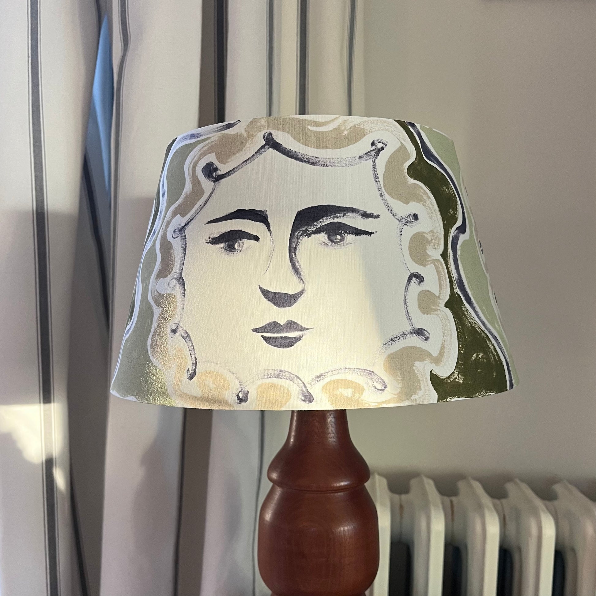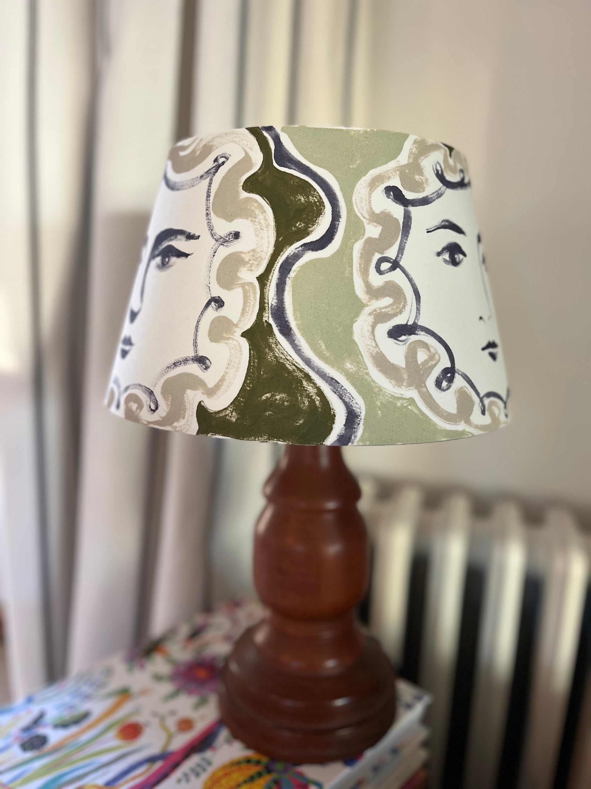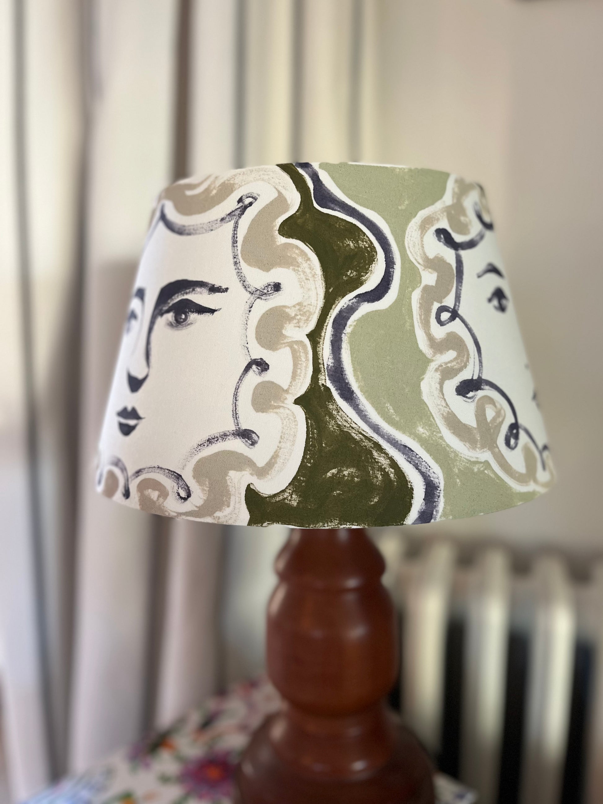 A hand-painted calico lampshade in Bancha and Cooking Apple Green on a classical theme of Ancient Greece, designed to bring a sense of myth and legend in to your home interiors.