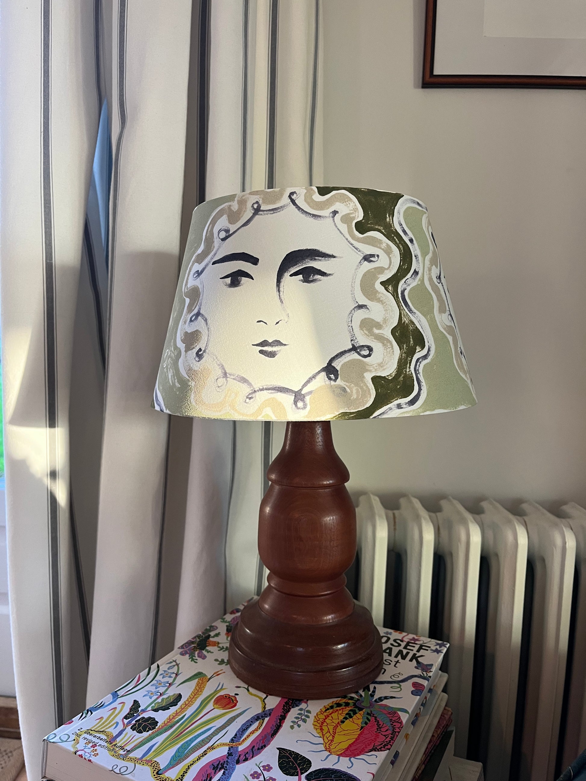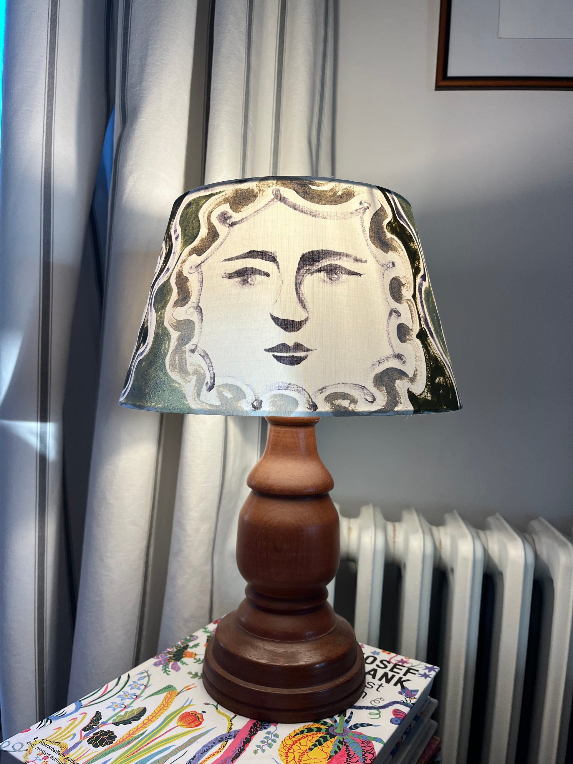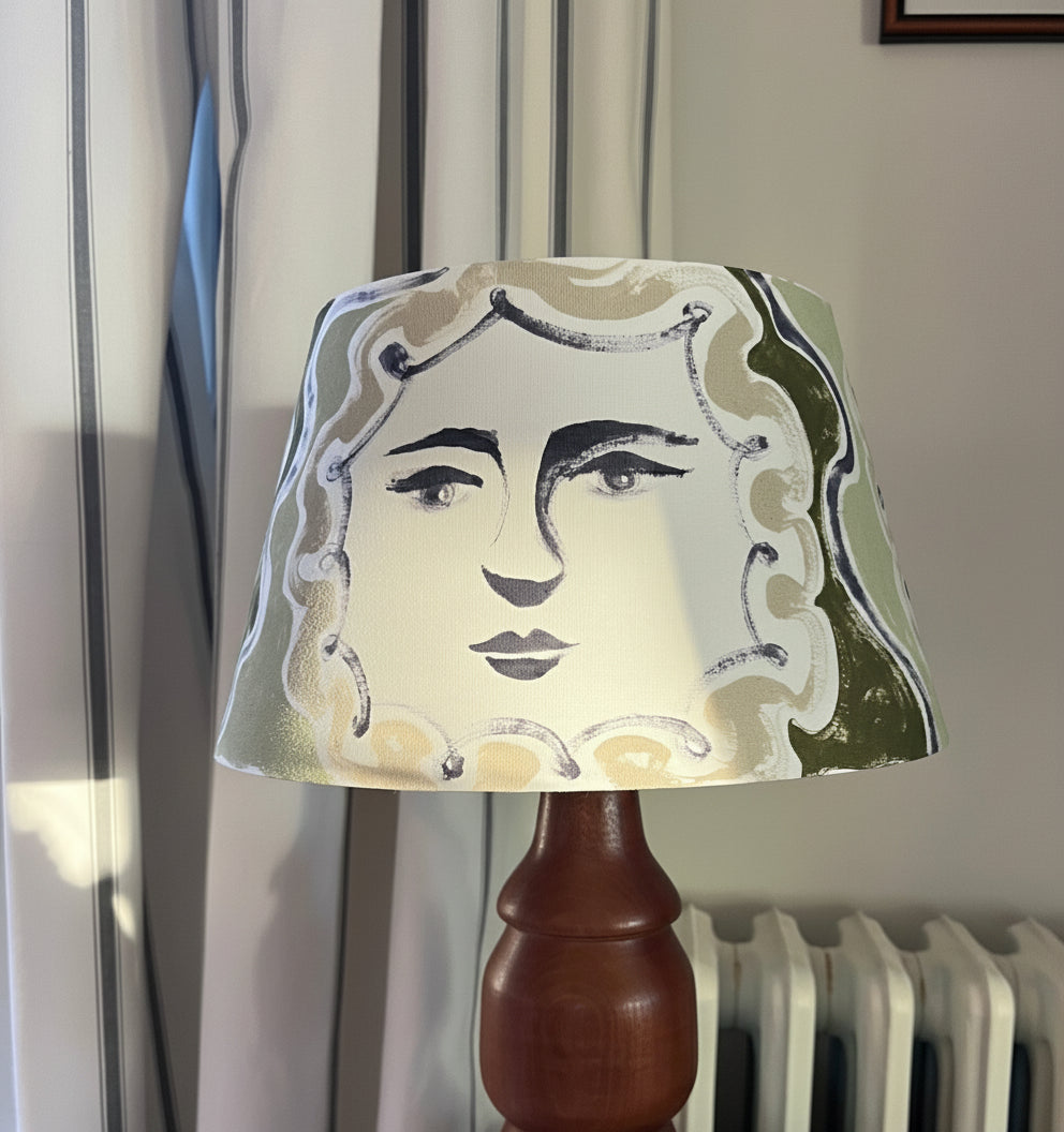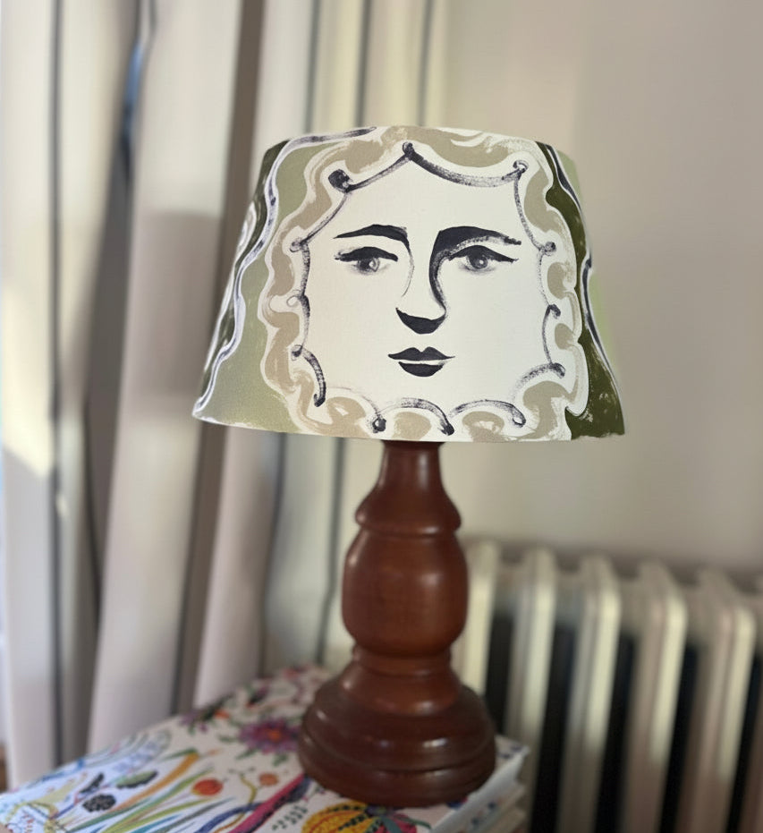 A hand-painted calico lampshade in Bancha and Cooking Apple Green on a classical theme of Ancient Greece, designed to bring a sense of myth and legend in to your home interiors.