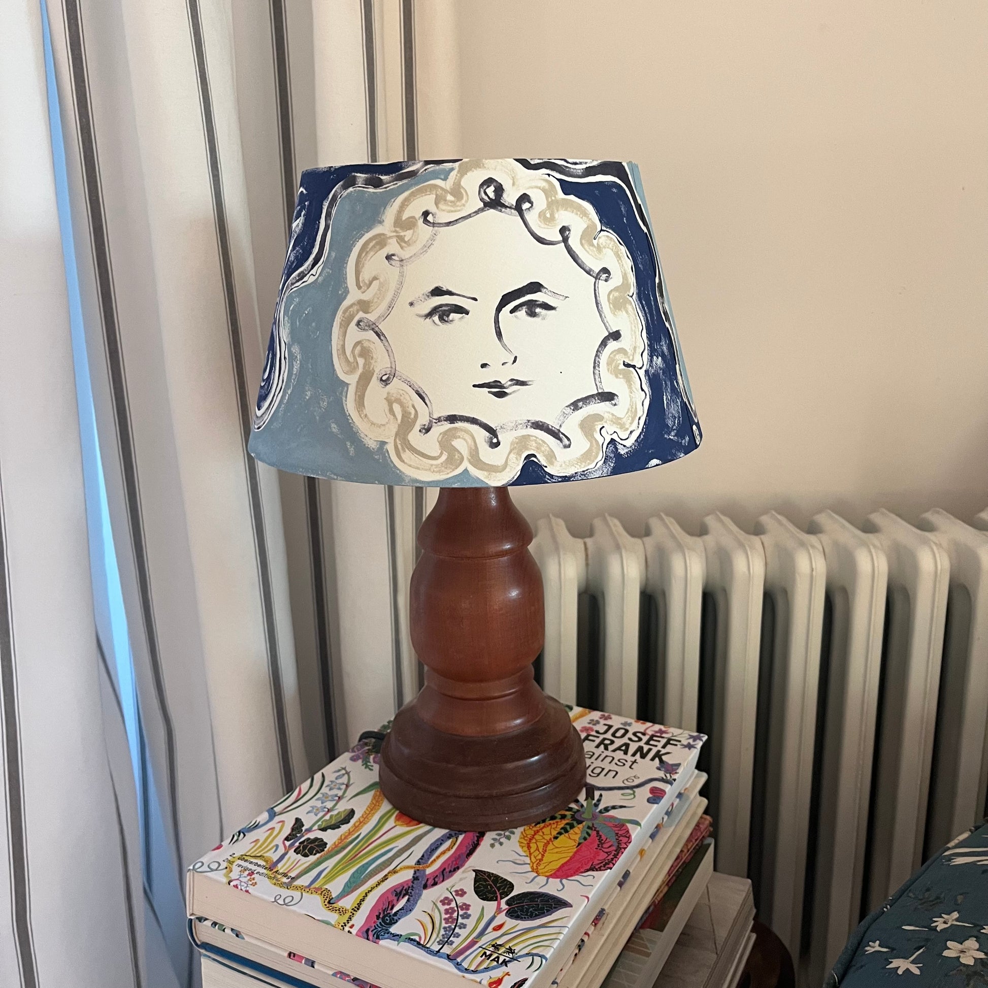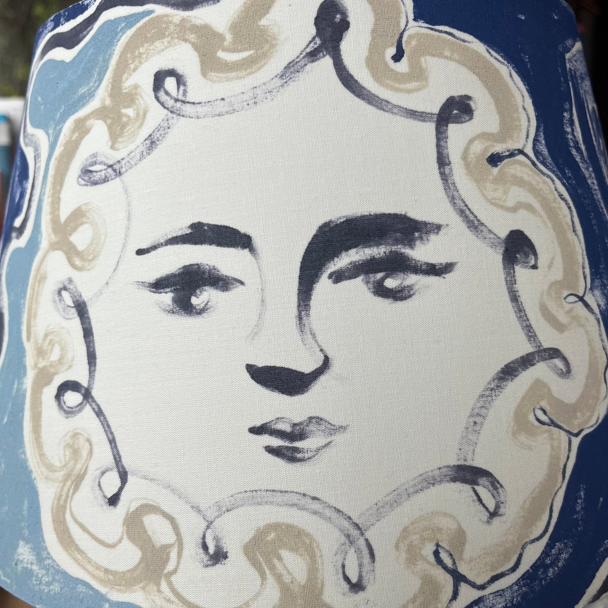 A hand-painted calico lampshade in Tingry and Pompadour Blue on a classical theme of Ancient Greece, designed to bring a sense of myth and legend in to your home interiors.